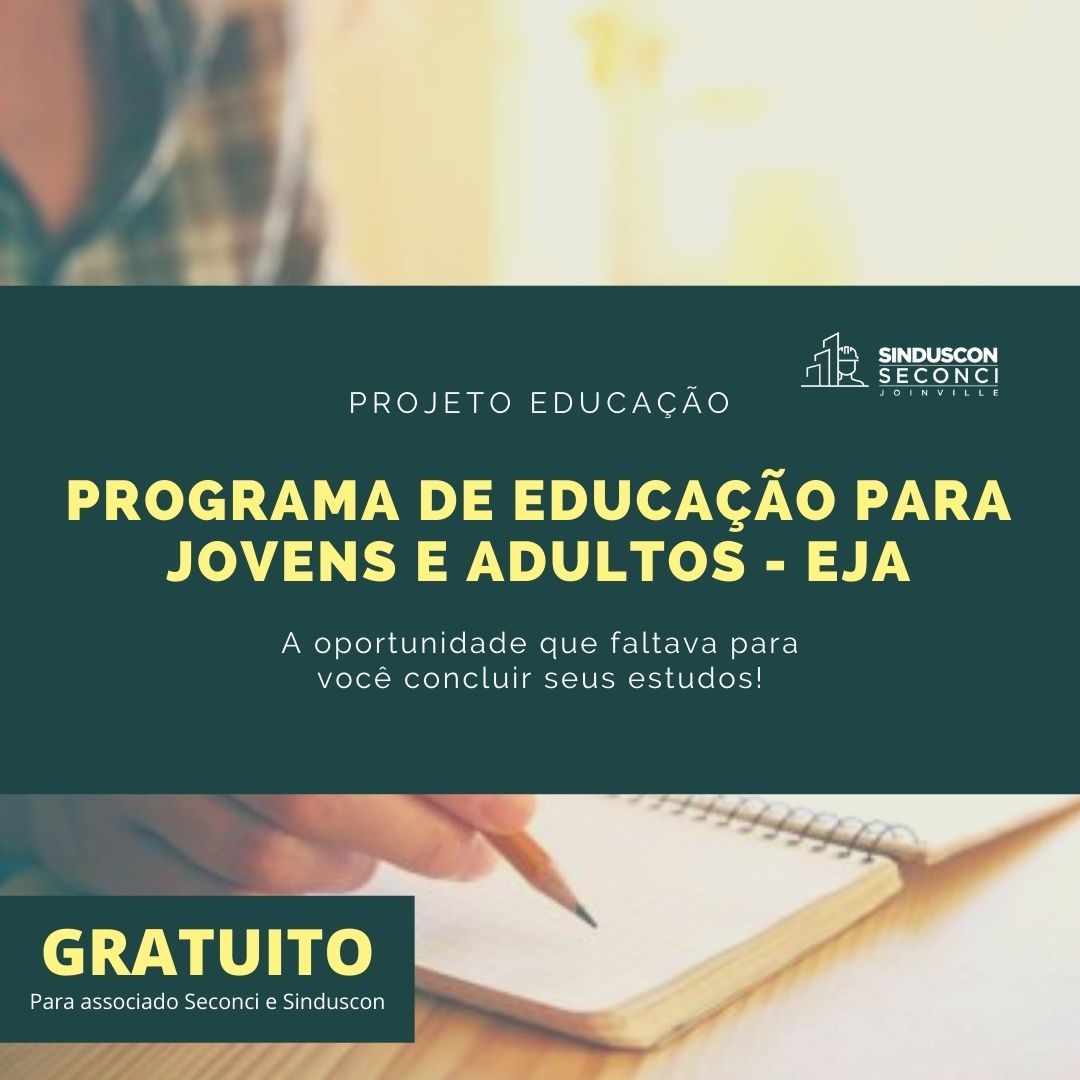 Diante disso, o SINDUSCON e o SECONCI estão dando início ao Projeto EJA, Educação de Jovens e Adultos, do SESI Joinville, que é a chance dos seus funcionários de concluir o ensino fundamental ou médio em uma instituição de qualidade, com certificado reconhecido pelo MEC, com curso de qualificação e de forma gratuita.